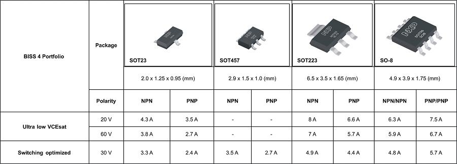 Single transistors Type Package Polarity VCEO IC ICM RCEsat typ (mΩ) @ IC; PBSS4021NT SOT23 NPN 20 4.3 8 36 PBSS4021NX SOT89 7 15 19 PBSS4021NZ SOT223 8 20 14 PBSS SOT23 PNP 3.5 8 55 PBSS4021PX SOT89 6.2 15 23 PBSS4021PZ SOT223 6.6 20 22 PBSS4041NT SOT23 NPN 60 3.8 8 46 PBSS4041NX SOT89 6.2 15 25 PBSS4041NZ SOT223 7 15 17.5 PBSS SOT23 PNP 2.7 8 80 PBSS4041PX SOT89 5 15 40 PBSS4041PZ SOT223 5.7 15 29 Double transistors(負載開關應用優化) Type Package Polarity VCEO IC ICM RCEsat typ (mΩ) @ IC; PBSS4021SN SOT96 (SO8) NPN/NPN 20 7.5 15 25 PBSS4021SPN NPN/PNP 7.5/6.3 15 25/36 PBSS4021SP PNP/PNP 6.3 15 36 PBSS4041SN NPN/NPN 60 6.7 15 32 PBSS4041SPN NPN/PNP 6.7/5.9 15/10 32/47 PBSS4041SP PNP/PNP 5.9 10 47