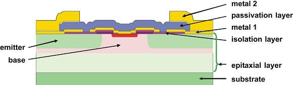 通過選擇不同的低電阻襯底,比如:圖1所示的摻磷/摻砷襯底,可以有效降低半導體中的電壓降比例。另一個重要的影響因素是電流分配,應在整個芯片范圍內盡可能保持均衡,將芯片前端金屬化擴展電阻降至最低。對于BISS晶體管,芯片中的均衡電流分配通過一種稱為網格技術的手段來實現——將晶體管分成不同的格柵結構。第四代BISS晶體管采用受專利保護的雙層金屬化布局,能夠最大程度提升發射極線路金屬厚度,降低飽和電阻(參見圖2)。