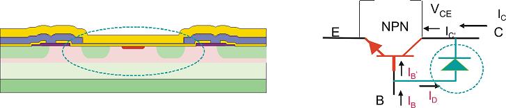 要在降低飽和電壓的基礎上縮短開關時間,關鍵是最大程度降低開關操作中晶體管的擴展電容。這主要通過集成寄生的鉗位結構(圖3)來實現,該設計可以避免過驅動處于飽和狀態的晶體管,能夠有效降低晶體管的存儲時間ts。