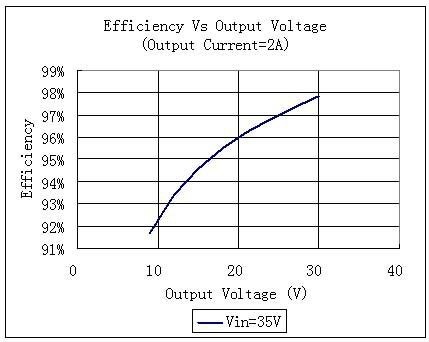 圖中的輸入電壓為35V,輸出電流為2A,當輸出電壓為30V時,效率可以高達97.8%。但是當輸出電壓降低到20V時,效率就降為96%;當輸出電壓降低為10V時,效率就降低為92%。在這三種情況下,盡管其輸出功率依次為60W,40W和20W,但是其損耗功率卻依次為1.2W,1.6W,1.6W。后兩種情況下功耗增大了33%。假如恒流模塊的散熱系統(tǒng)設計得非常臨界,增加33%的耗散功率就有可能會使芯片的結溫升高,以致發(fā)生過溫保護而無法工作,嚴重時也有可能使芯片燒毀。