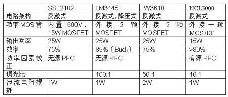 目前市場上主要有恩智浦的SSL2101/2,國半的LM3445,iWatt的iW3610和OnSemi的NCL3000四種兼容可控硅調(diào)光的驅動IC。其特點如下: