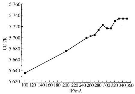 由圖4可知,當正向電流為350mA時,色溫為5734K,而正向電流增加到350mA時,色溫就偏移到5636K。電流再進一步減小時,色溫會向暖色變化。
