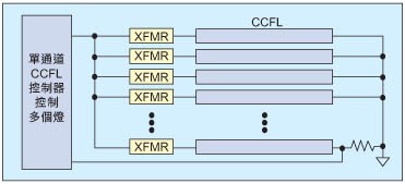 CCFL已在筆記型電腦、數(shù)位相機(jī)、導(dǎo)航系統(tǒng)以及其他具有較小LCD螢?zāi)坏脑O(shè)備中使用多年。這些類型的設(shè)備通常只用一個(gè)CCFL,因此,傳統(tǒng)設(shè)計(jì)只用一個(gè)CCFL控制器。隨著大尺寸LCD面板的出現(xiàn),帶來(lái)對(duì)多CCFL的需求,有必要采用新的方式來(lái)應(yīng)對(duì)這種新的需求。可能的方式之一是采用一個(gè)單通道CCFL控制器來(lái)驅(qū)動(dòng)多個(gè)燈(圖5)。這種方式中,CCFL控制器只透過(guò)其中的一個(gè)燈來(lái)監(jiān)測(cè)燈電流,而以幾乎相同的交流波形同時(shí)驅(qū)動(dòng)所有并聯(lián)的燈。然而,這種方式存在著幾個(gè)缺陷。
