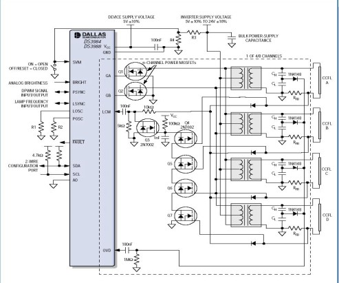 DS3984/DS3988采用推挽驅(qū)動(dòng)架構(gòu),可以使用更低成本、更高效率的n通道MOSFET。轉(zhuǎn)換器直流電源電壓也可采用更高的電壓。單獨(dú)的燈控制和監(jiān)測(cè)可提供均勻的亮度,并減少轉(zhuǎn)換器的元件總數(shù)。采用單獨(dú)的燈控制時(shí),如果某一個(gè)燈失效,僅會(huì)使這個(gè)失效的燈停止工作,其他燈繼續(xù)工作,并不會(huì)受影響。片上振蕩器產(chǎn)生的燈頻和脈沖調(diào)光頻率被嚴(yán)格限定在±5%水準(zhǔn),消除了對(duì)於顯示影像的影響,并且也可被同步至外部時(shí)脈源。