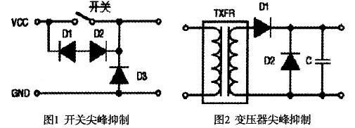 圖1中的二極管用于抑制高壓開關的尖峰電壓。圖2是典型的變壓和整流電路,D2是肖特基或齊納二極管,用于抑制濾波后的尖峰瞬態噪聲電壓。