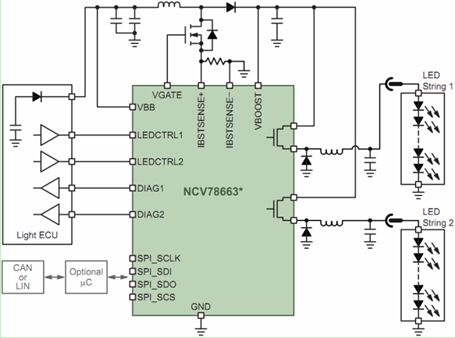 安森美半導體針對LED汽車前照燈系統開發了NCV78663電源鎮流器及雙LED驅動器。NCV78663是先進的高可靠性、高能效的系統級芯片(SoC) LED驅動器,支持達2 A電流,提供高于90%的總能效,驅動高達60 V電壓的多串LED,能以PWM調光維持色溫及控制平均電流,使設計人員能夠以一顆高集成度的SoC控制遠光燈及近光燈、日間行車燈、轉向指示燈及霧燈,所需外部元件極少。這器件通過SPI接口與外部微控制器通信,在上電后動態地控制系統參數、檢測LED工作狀態并反饋診斷信息。圖4顯示的是NCV78663在先進的汽車前照燈應用中的電路圖。