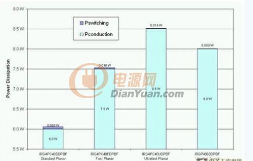 低壓側IGBT同樣有同一問題。究竟哪一種IGBT才能提供最低的功耗?由于這些IGBT只會進行 50Hz或60Hz切換,如圖5所示,標準速度IGBT可提供最低的功耗。雖然標準IGBT會帶來一些開關損耗,但數值并不足以影響IGBT的總功耗。事實上,最新的槽柵IGBT仍然擁有較高的功耗,因為這一代的槽柵IGBT專門針對高頻率應用而設計,以平衡開關和導通損耗為目標。因此,對低壓側IGBT 來說,標準速度平面式IGBT仍然是必然選擇。