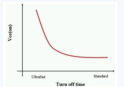 IGBT基本上是具備金屬門氧化物門結構的雙極型晶體管 (BJT) 。這種設計讓IGBT的柵極可以像MOSFET一樣,以電壓代替電流來控制開關。作為一種BJT,IGBT的電流處理能力比MOSFET更高。同時,IGBT亦如BJT一樣是一種少數載體元件。這意味著 IGBT關閉的速度是由少數載體復合的速度快慢來決定。此外,IGBT的關閉時間與它的集極-射極飽和電壓 (Vce(on)) 成反比(如圖3所示)。