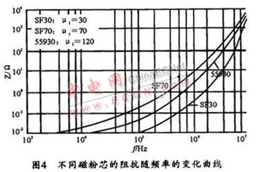 共模電感線圈如圖l中Lcl,Lc2是繞在一只磁芯上的兩組獨立的線圈,所繞圈數相同,繞向相反。這樣,當EMI濾波器接入電路后,兩組線圈產生的磁通在磁芯中將相互抵消,故不會使磁芯飽和。對于干擾信號而言,共模磁芯一般工作在低磁場區域,所以,共模濾波電感選用的磁性材料要求具有較高的初始磁導率μi。如果只針對濾波器的插入損耗這一指標,則初始磁導率μi越高,濾波電路呈現的感抗就越大,所得到的插入損耗指標就越好。但在整個電路中,還要綜合考慮磁性材料在電路中的其它特性,如頻率阻抗特性、居里溫度、磁材的形狀等等。μi值不同的各種磁性材料,在不同頻率下的阻抗特性也不一樣,故要根據所需要的頻率范圍來選取合適μi值的磁性材料。圖3所示是不同類型的高μi軟磁材料在同樣條件下的頻率與阻抗關系曲線,該曲線反映出電感磁芯的插入損耗變化趨勢。其它的性能參數(如電感值、體電阻等)如表1所列。