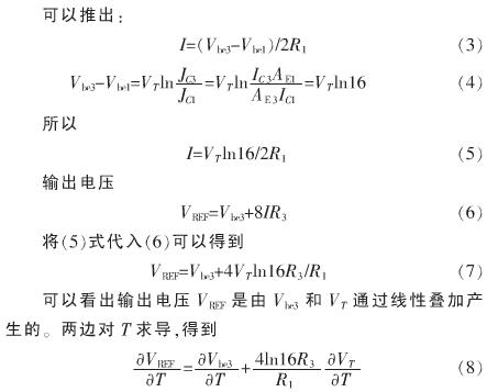 帶隙基準電壓源的目的是產生一個對溫度變化保持恒定的量,由于雙極型晶體管的基極電壓VBE,其溫度系數在室溫(300 K)時大約為-2.2 mV/K,而2個具有不同電流密度的雙極型晶體管的基極-發射極電壓差VT,在室溫時的溫度系數為+0.086 mV/K,由于VT與VBE的電壓溫度系數相反,將其乘以合適的系數后,再與前者進行加權,從而在一定范圍內抵消VBE的溫度漂移特性,得到近似零溫度漂移的輸出電壓VREF,這是帶隙電壓源的基本設計思想。