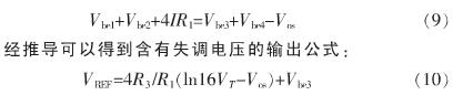 基準源中運放的設計是非常重要的,運放的失調是基準源的一個主要誤差源。由于不對稱性,運放會受到輸入失調的影響。假設失調電壓為Vos,經計算得到含失調電壓的輸出公式為: