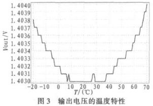 溫度在-20~70℃之間變化,輸出電壓溫度特性如圖3所示,它的溫度系數約為10 ppm/℃。因此,可以看出輸出電壓的溫度特性并不是一直都為零,而是在一個溫度范圍內為零,在其他溫度下為正值或者負值。這是由于基極一發射極電壓、集電極電流、失調電壓以及電阻隨溫度變化引起的。