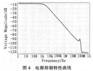圖4是在1 Hz到10 GHz的范圍進行掃描所得到的不同的電源抑制情況。低頻時抑制情況不太好,在-10 dB左右,還有待于提高;高頻抑制情況很好,基本穩定在-120 dB左右。與傳統電路相比,本文提出的這種電路可以用于在各種系統尤其是高頻系統中,這一點是傳統電路所無法比擬的。
