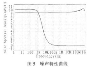 噪聲是影響帶隙基準源穩定性的主要因素之一。通常噪聲分為外部噪聲和內部噪聲。外部噪聲一般都由電源電壓的變化以及其他電路的干擾造成。內部噪聲主要包括熱噪聲和閃爍噪聲。閃爍噪聲的大小與頻率成反比,因而在低頻下主要為閃爍噪聲,而高頻下為熱噪聲,對于高頻的熱噪聲,可以在輸出端Vref處加一個RC低通濾波器解決掉,而低頻的來自耦合到電源的噪聲則是需考慮的,可以通過提高電源抑制比來減小。圖5為電路在輸出端和電源電壓處的噪聲特性,在輸出端低頻時噪聲為10.4 nv/Rt,高頻時噪聲幾乎為0 nv/Rt,性能很好。電源電壓處的噪聲為9.6nv/Rt左右。