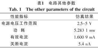電路的其他方面的性能仿真結果如表1所示。表1的仿真結果是在電源電壓為3.3 V的條件的測得的。有效電流指的是在電路正常工作的情況下從電源到地之間的電流,關斷電流指的是在電路不工作的情況下從電源到地的漏電流。