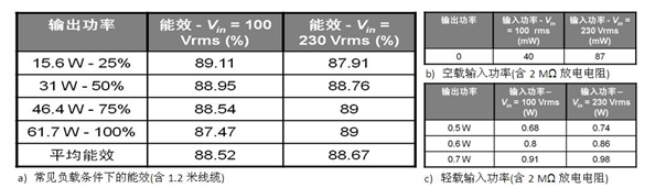 表 1:基于 NCP1250 的 65 W 演電源適配器演示板能效測試結果。