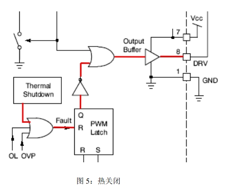熱關閉(TSD):過熱保護功能有助于實現良好的電源設計。當結點溫度超過140℃時,該功能激活,驅動器變為低電平;結點溫度降到典型值30℃時器件恢復工作。