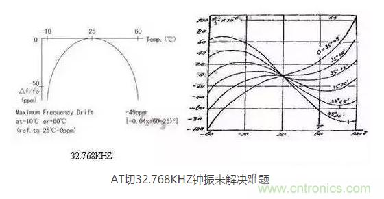AT切晶體頻率溫度曲線為三次曲線,呈躺著的"S"型曲線,隨著溫度的變化,溫漂呈"S"型軌跡變化,大致在-10℃和+60℃時,有兩個"拐點",即溫漂又會反方向拐回來。因此,只要控制好晶片的切角在一定的公差范圍內(nèi),那么保證兩個拐點溫漂在-40℃~85℃時不超過±30ppm并不是一件難事。然而,AT切晶體只針對MHZ頻率的晶體,如何轉(zhuǎn)換成32.768KHZ頻率?鐘振32.768KHZ通過分頻方式,便可以實現(xiàn)。如采用AT切16.777216MHZ晶體,通過512分頻,那么就可以得到想要的32.768KHZ頻率。鐘振實現(xiàn)對頻率的分頻并不困難,都集成在振蕩IC內(nèi)部。因此,使用AT切MHZ 分頻實現(xiàn)的32.768KHZ鐘振,在頻率溫度特性上,有很大的改良,在沒有進行溫度補償?shù)臅r候,-40℃~85℃條件下,溫度頻差保持在±30ppm甚至±20ppm都是可以實現(xiàn)的。
