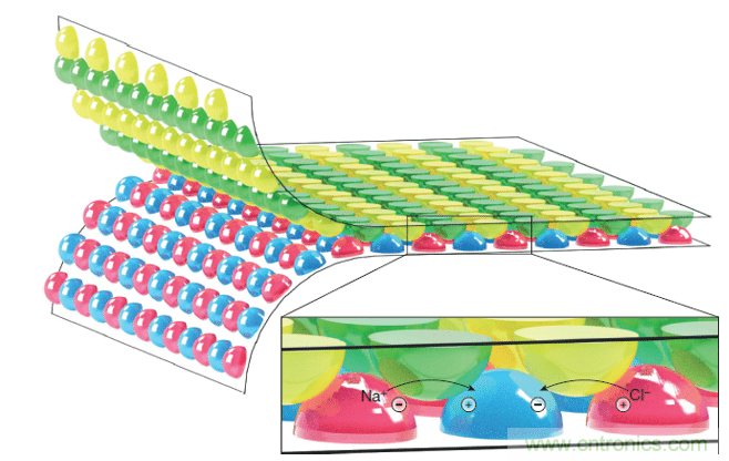 紅色凝膠含有鹽水,而藍色凝膠含有淡水。離子原本會從紅色凝膠流向藍色凝膠,但由于基板的間隔,無法出現這樣的流動。與此同時,與這塊基板對應的另一塊基板上布置了綠色和黃色凝膠,當它們橋接在藍色和紅色凝膠之間的空隙時,就能為離子運動提供通道。