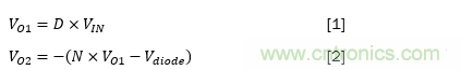 其中VIN是輸入電壓,VO1和VO2分別是主和次級輸出,D是占空比,N是變壓器匝數比,是二極管的正向壓降。