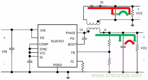 其中,VIN是輸入電壓,VO1是輸出電壓,D是占空比,IOUT是輸出電流,IL是電感器電流。