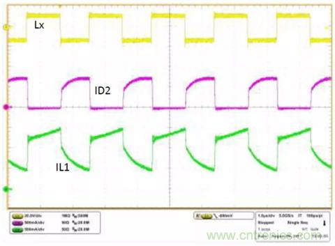 圖2. ISL85413DEMO3Z在VIN=9V、VO1=VO2=5V、IO1=IO2=100mA時的工作波形