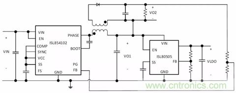 圖3.生成兩個+ VOUT軌的隔離式降壓拓撲(ISL85415DEMO2Z)