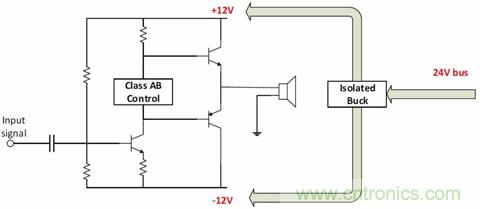 為這類應用選擇合適的拓撲時,需要考慮輸入電壓。例如,為以±12V軌運行的音頻放大器供電,如果輸入電源軌是24V,就選擇隔離式降壓拓撲。如果使用12V電池,就可以用反相降壓-升壓拓撲,以生成負壓軌。如果使用5V USB、12V電池或綠色能源供電的系統,就應該采用隔離式降壓-升壓拓撲。圖12說明了如何用各種拓撲給音頻放大器供電。
