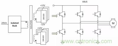 隔離式柵極驅動器一般用于大功率逆變器應用,包括UPS系統、電機控制、高密度放電(HID)燈鎮流器和感應加熱。其他應用包括AC和DC變速驅動、工業/太陽能逆變器和伺服驅動。圖13顯示了使用隔離式降壓轉換器的具有IGBT柵極驅動偏置的3相逆變器。