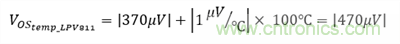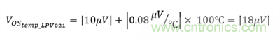 為最小化偏移誤差,LPV821零漂移毫微功耗運(yùn)算放大器是一款理想器件。 使用Equation 5并假設(shè)操作溫度范圍為0°C—100°C,該器件產(chǎn)生的最大偏移誤差為: