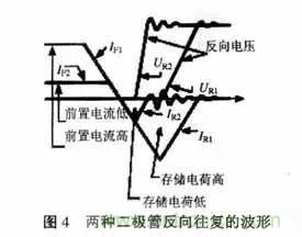圖4是存儲電荷高或低的兩種二極管電流、電壓波形。從圖中可以看出存儲電荷少時,反向電壓的斜率大,并且會產生有害的振動。而前置電流低則存儲電荷少,即在空載或輕載時是最壞條件。所以進行優(yōu)化驅動電路設計時應著重考慮前置電流低的情況,即空載或輕載的情況,應使這時二極管產生的振動在可接受范圍內。