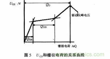 柵極電荷QG包含了兩個部分:柵極到源極電荷QGS;柵極到漏極電荷QGD—即“Miller”電荷。QGS是使柵極電壓從0升到門限值(約3V)所需電荷;QGD是漏極電壓下降時克服“Miller”效應所需電荷,這存在于UGS曲線比較平坦的第二段(如圖5所示),此時柵極電壓不變、柵極電荷積聚而漏極電壓急聚下降,也就是在這時候需要驅動尖峰電流限制,這由芯片內部完成或外接電阻完成。實際的QG還可以略大,以減小等效RON,但是太大也無益,所以10V到12V的驅動電壓是比較合理的。這還包含一個重要的事實:需要一個高的尖峰電流以減小MOS管損耗和轉換時間。
