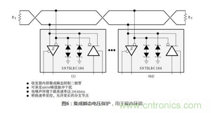 圖6所示內部集成瞬態抑制二極管的485收發器SN75LBC184,用于既希望使用完整485功能,PCB空間又受限的場合。SN75LBC184在內部集成了保護二極管,針對高能量電氣噪聲環境,可直接替換SN75LBC176。
