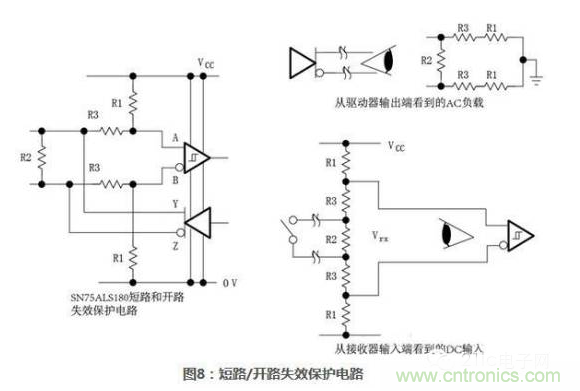 使用這樣的內部上下拉電阻允許總線不進行終端匹配,但是會顯著的降低最大信號速率和可靠性。圖7給出了一些485接口通用外置失效保護電路,每個電路都盡力維持接收器輸入端電壓不小于最小臨界值并在一個或多個故障條件(開路、空閑、短路)下,維持一個已知的邏輯狀態。