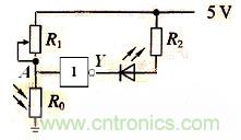 隨著城市化進(jìn)程的加快發(fā)展,城市建設(shè)也趨于現(xiàn)代化、人文化、科技化,城市道路兩旁的路燈也成了一座城市獨(dú)特的風(fēng)景線,其自動控制不但節(jié)省人力,還節(jié)約了能源。如圖所示是自動控制路燈的邏輯電路原理圖,其中R0是光敏電阻,光越強(qiáng)烈,光敏電阻R0的阻值越小,R1與R0串聯(lián)時所分的電壓就越小,A點(diǎn)輸入低電位,通過非門后,輸出端Y為高電位,所以路燈自動熄滅。光越微弱,光敏電阻R0的阻值越小,R1與R0串聯(lián)時所分的電壓就越大,A點(diǎn)輸入高電位,通過非門后,輸出端Y為低電位,所以路燈自動接通。