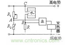 許多家庭都安裝了電熱水器,它給人們的生活帶來了方便。如圖所示是電熱水器系統(tǒng)的恒溫器集成電路。R1為調(diào)溫電阻,R2為熱敏電阻。“與”門電路的兩個輸入端分別接上一個水位傳感器和一個水溫傳感器。當(dāng)水箱充滿水時,B點(diǎn)為高電壓(即輸入為邏輯1),R2為熱敏電阻,溫度越低,熱敏電阻的阻值越大,兩端的分壓越大,當(dāng)電壓達(dá)到一定程度時,A點(diǎn)為高電壓(即輸入為邏輯1),當(dāng)A和B都為高電壓時,“與”門的輸出端為高電壓,電熱水器的加熱開關(guān)才會接通電源,對水箱中的水進(jìn)行加熱。當(dāng)溫度高于一定溫度時,R2的電阻變小,R2兩端的電壓變小,發(fā)熱器停止加熱,所以熱水器處于保溫狀態(tài)。當(dāng)水箱水不滿時,或者溫度高時發(fā)熱器都不會加熱。