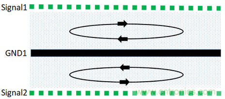 根據麥克斯韋方程,分立的帶電體或電流,它們之間的一切電的及磁的作用都是通過它們之間的中間區域傳遞的,不論中間區域是真空還是實體物質。在PCB中磁通總是在傳輸線中傳播的,如果射頻回流路徑平行靠近其相應的信號路徑,則回流路徑上的磁通與信號路徑上的磁通是方向相反的,這時它們相互疊加,則得到了通量對消的效果。