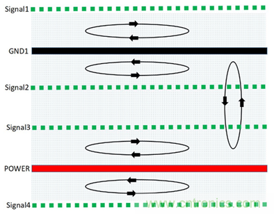 (1)由于信號層與回流參考平面相鄰,S1、S2、S3相鄰地平面,有最佳的磁通抵消效果,優選布線層S2,其次S3、S1。