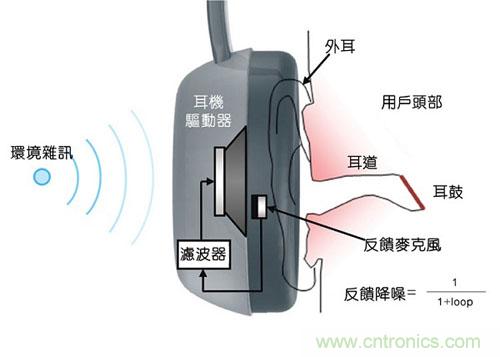 反饋降噪耳機(圖5)的工作原理主要是檢測耳鼓區(qū)域的噪聲,然后形成一個基本的反饋回路,以便最大限度地降低該區(qū)域的噪聲級。