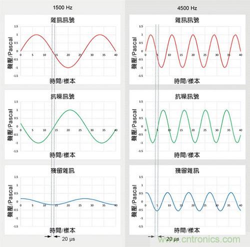 前饋降噪帶寬,在低頻處被耳機驅(qū)動模塊限制在50Hz左右,在高頻處被聲學結(jié)構(gòu)和訊號處理延遲限制于3kHz。延遲會導致難以在抗噪訊號和噪聲訊號之間實現(xiàn)180度的相位反轉(zhuǎn),高頻部份因為波長較短更難處理。圖2顯示了兩種頻率下20μs延遲對降噪效果的影響:頻率為1500Hz時,殘余噪聲約剩1/5(14dB ANC),但頻率為4500Hz時,即使延遲不變,殘余噪聲也已增加到3/5(僅4dB ANC)。