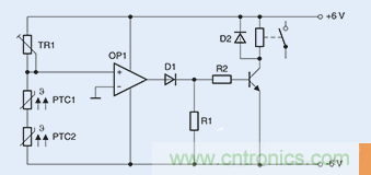 至于TR1,在設置時,其最大值應約等于常溫電阻的兩倍。而TR1還能夠相應地進行微調。在冷態下,非反相輸入端將出現電位,而這一電位相比反相輸入端電位則具有較高的負電位。這則意味著比較器輸出端出現負電壓。若某一個或兩個正溫度系數 (PTC) 傳感器達到相應的溫度限值,則分壓器的電位將出現變化,而比較器則將進行切換,并發送一個正輸出信號,進而切斷晶體管。