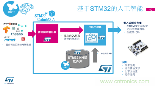 “順應嵌入式行業潮流,ST將會在STM32新產品中嘗試融合RTOS和Linux兩大系統。同時,在數據安全方面,ST支持TrustZone的全新系列產品也即將上市,通過采用STM32架構和Arm® Cortex-M33® 內核實現了更高的安全性。而且ST還開發出STM32物聯網安全工具箱,能夠在STM32上實現可擴展的嵌入式安全功能;以及通過認證的STM32軟件開發工具——符合IOS智能家居標準的Apple Homekit BLE,這套工具將于2018年中期率先支持STM32L476 (512 kB+閃存)和 STM32F413平臺,之后支持STM32WB系列。”Daniel Colonna強調,“ST還將致力于為廣大工程師帶來更簡單的AI開發工具,允許在STM32上運行優化后的神經網絡生成的代碼,加速開發圖像分類、語音激活文字等應用。”