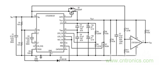 超級電容器具有緊湊、堅固和可靠的特點,并能支持用于應(yīng)對短期掉電過程中后備系統(tǒng)的電源要求。與電池相似,它們也需要在輸出端進(jìn)行謹(jǐn)慎的充電和功率調(diào)節(jié)。LTC®3226 是一款具有一個電源通路 (PowerPath™) 控制器的兩節(jié)串聯(lián)超級電容器充電器,可簡化后備系統(tǒng)的設(shè)計。特別地,該器件包含一個具可編程輸出電壓和自動電池電壓平衡功能的充電泵超級電容器充電器、一個低壓差穩(wěn)壓器和一個用于實現(xiàn)正常模式與后備模式之間切換的電源故障比較器。低輸入噪聲、低靜態(tài)電流和緊湊的占板面積使 LTC3226成為緊湊、手持和電池供電型應(yīng)用的理想選擇。這款器件采用3mm x 3mm 16引腳QFN封裝。
