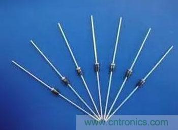 肖特基二極管有很多的封裝形式。圖8-24給出了一些例子,封裝的材料有塑料、玻璃、金屬、陶瓷、或這幾種的組合。使用的尺寸和外形不很多,一般來說,器件越大,額定電流越大。肖特基二極管的封裝常標明了陰極引腳。在陰極引腳邊通常都有一個或多個圓環,圖8-24中的DO-41封裝就是采用這種方法。有一些老的封裝形式使用一個斜坡或是一個+號來標明陰極端。
