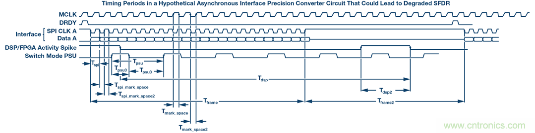 在圖15中,標記了各種定時周期,這很容易干擾SFDR或導致抖動。如果SPI通信未頻鎖到MCLK,則可能發生雜散。掌握布局技術是您緩解此問題的最大保障。頻率表現為混疊下行干擾源,但也作為拍頻和交調產物。例如,如果SPI在16.01 MHz下運行,MCLK在16 MHz下運行,則應在10 kHz下發生雜散。