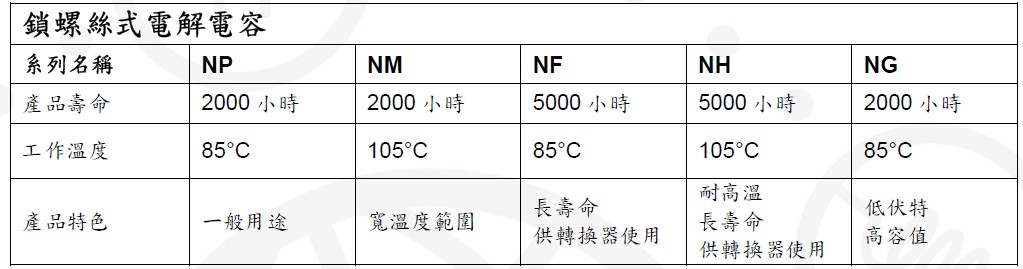 全新推出的工業(yè)級超長效鎖螺絲式電解電容系列包括NP、NM、NF、NH、NG 等五個系列,分別鎖定一般用途、寬溫度范圍、長效轉換器、高溫環(huán)境轉換器以及低電壓大容值等應用。工作溫度范圍涵蓋85°C 至105°C;使用壽命時效,則一舉提升至2000 到5000 小時。與其他同類型產品相比,具備難以匹敵的寬溫度范圍及長時效特性。