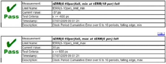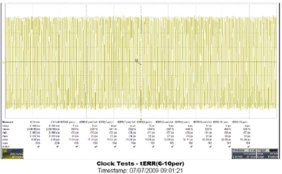 JEDEC標準要求測量n分別為2、3、4、5、6-10、11-15時tERR(n per)的最大及最小值。對于這樣的要求,如果要用手工測量將是非常耗時且低效率的。力科QPHY-DDR2軟件包的時鐘測量部分支持上述所有參數的自動測量,僅需使用一根差分探頭將時鐘信號接入示波器即可完成所有的測量工作,測量后的所有參數結果及對應波形將列在自動生成的測試報告中并與JEDEC標準中門限值進行比較。如下圖為使用QPHY-DDR2測量tERR(6-10 per)時的部分結果與對應波形。