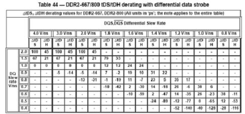 時序測試部分主要對DDR2數據、時鐘及控制線上各種時序進行測量,包括數據輸入建立/保持時間、數據輸出保持時間、數據讀/寫時DQS前導/后續時間、時鐘半周期寬度、DQS輸入高/低脈沖寬度等等二十余項參數。其中,在對數據輸入建立/保持時間(tDS、tDH)進行測量時,JEDEC標準規定需要根據寫數據時的DQ及DQS信號斜率對測得的建立保持時間進行修正。下表為JEDEC標準中對應DDR2 667/800的輸入建立/保持時間修正參數表。例如,寫操作時當DQ測得的斜率為1.5V/ns,DQS斜率為3.0V/ns時,測得的DQ – DQS建立/保持時間需要加上67ps的修正值之后方能與標準中規定的最小建立/保持時間相比較。