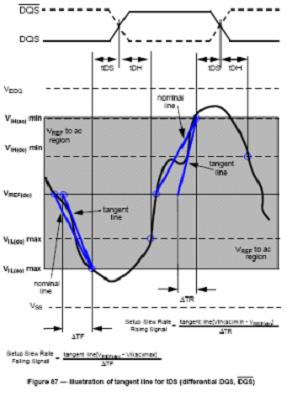 為了在上表中查到對應的修正值,需要首先得出相應信號的斜率。JEDEC標準規定了兩種斜率計算方法,即直連斜率norminal slew rate和切線斜率tangent slew rate,分別在不同數據波形時采納。兩種斜率計算方法如下圖所示。