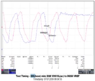 DDR2電氣性能測試部分主要測量各信號的直/交流邏輯高/低電平、信號過沖/下沖幅度及范圍、差分信號DQS及Clock輸入電壓及交叉點電壓、DQ及DQS輸出信號上升/下降沿斜率(SoutR、SoutF)最大/最小值、DQ,DQS及Clock輸入信號上升/下降沿斜率(SlewR、SlewF)最小值等等。